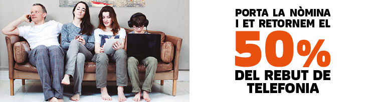 * Per participar en la promoció cal domiciliar una nova nòmina d'import mínim 600 € o pensió d'import mínim 300 €. Es retornarà el 50% del rebut de telefonia durant tres mesos (març, abril i maig de 2016), un rebut al mes, el d'import superior.Devolució màxima mensual de 25€. Devolució màxima global de la promoció: 75 €.